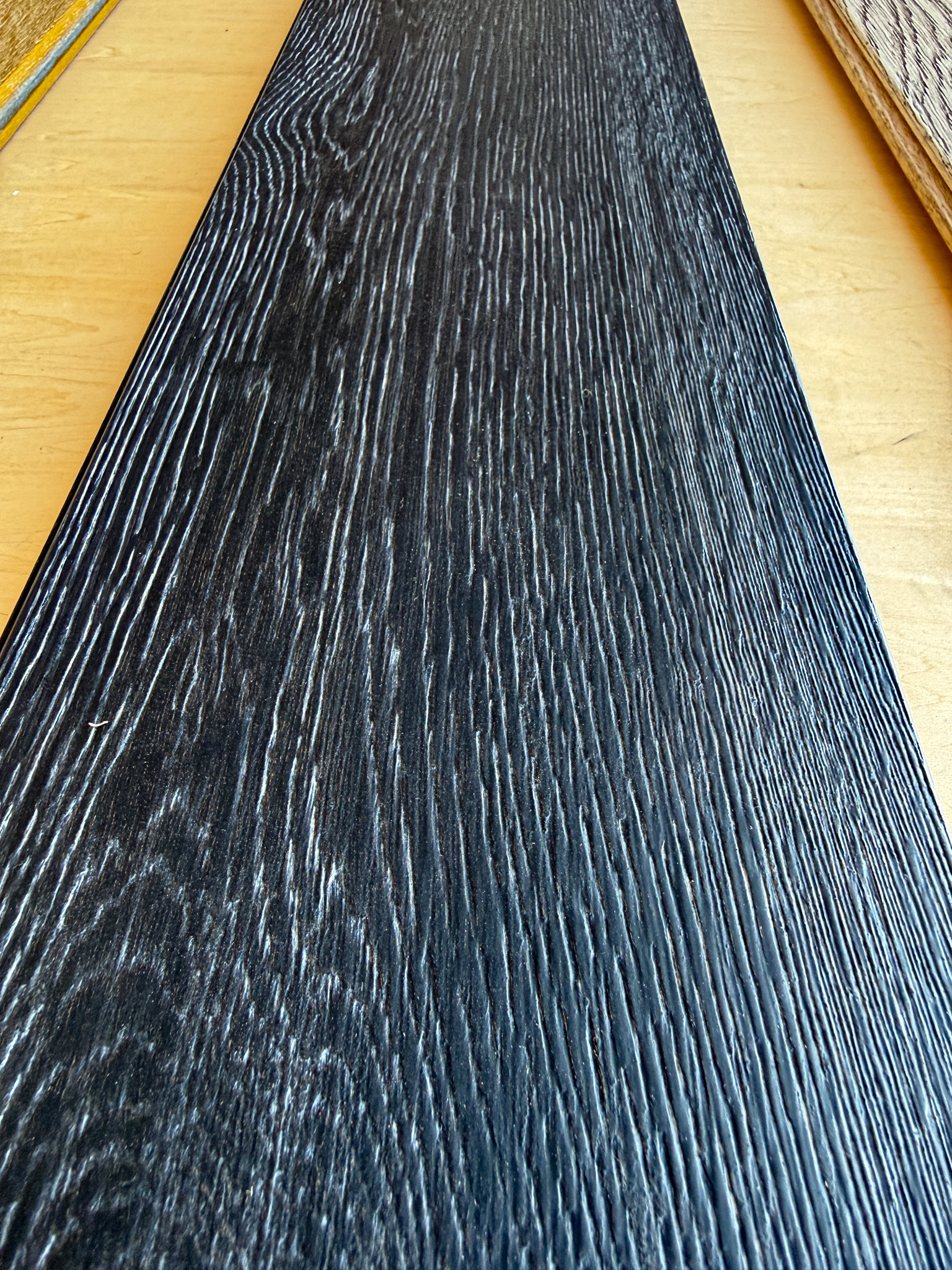 無垢材のナラフローリングでも特に貴重な一枚物の幅広を使い、浮造りをして、黒をベースに杢目にメタル塗装でシルバーをいれています。