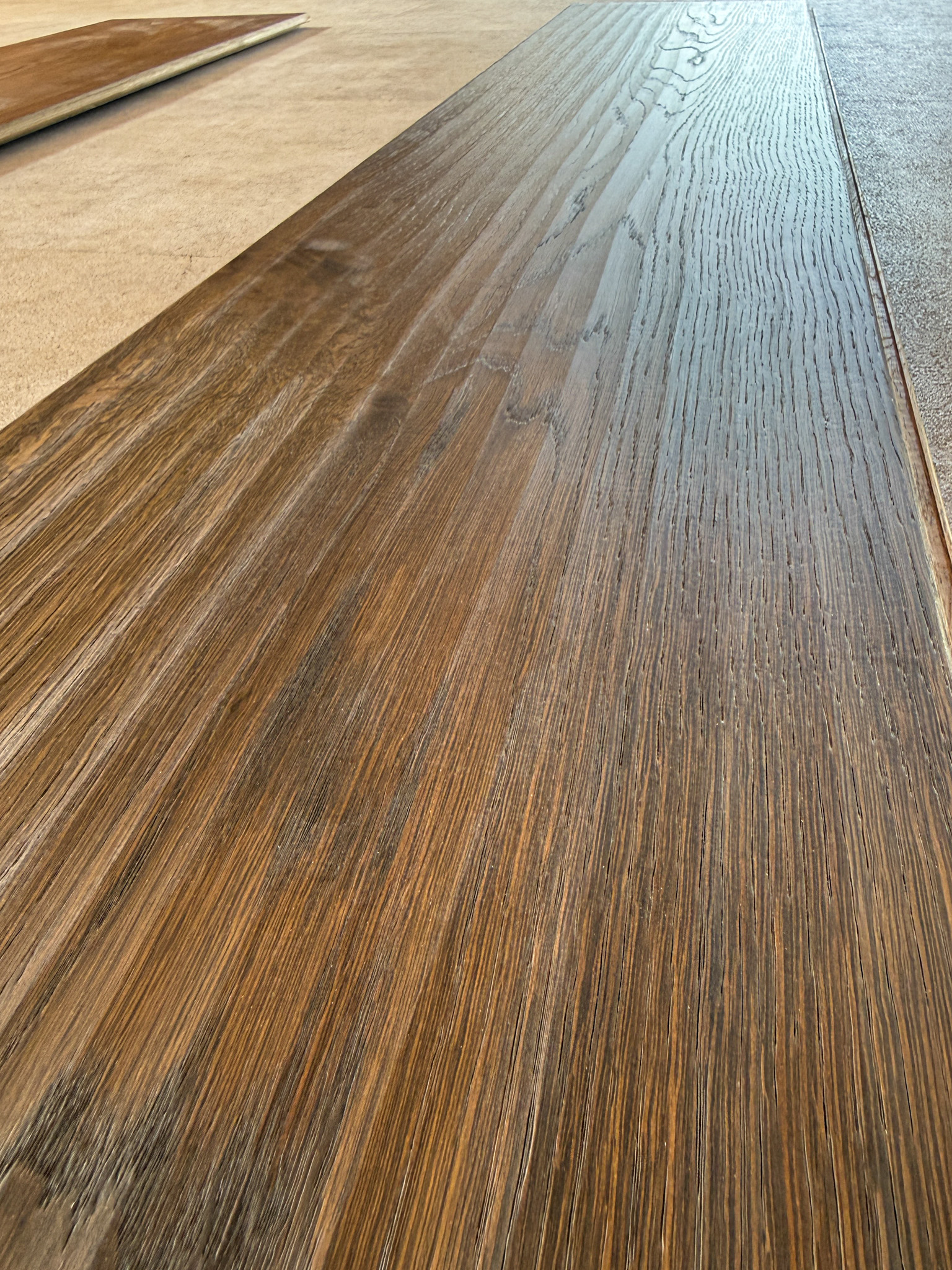 表面材には、厚さ4mmもの贅沢なヨーロピアンオーク挽板を採用。その豊かな厚みにより、職人の手仕事を感じさせる「ハンドスクレイプ加工」を施すことができ、唯一無二の陰影と質感を堪能いただけます。