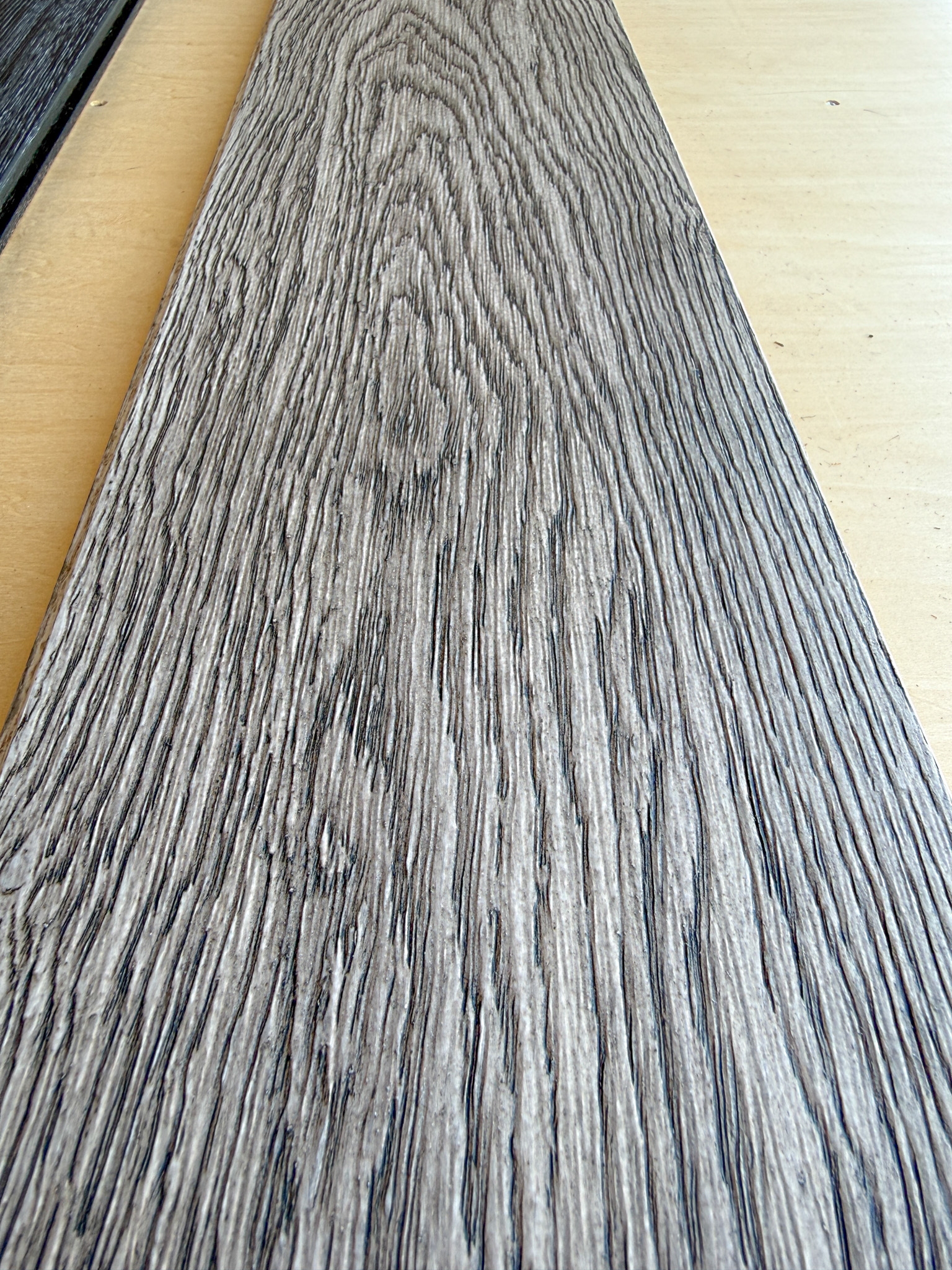 無垢材のナラフローリングでも特に貴重な一枚物の幅広を使い、浮造りをして、ホワイトをベースに杢目にブラックをいれてメタル調にしています。